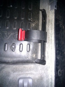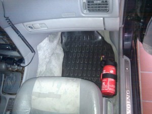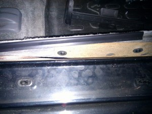Abgemacht werden muss die Einstiegsleiste (zwei Kreuzschlitz-Schrauben), anschließend kann der Türgummi und die Teppichbefestigung gelöst werden. Dann einfach zwei Löcher an den passenden Stellen bohren und entsprechend lange Schrauben mit ordentlich großen Unterlegscheiben durch, festschrauben und Verkleidung wieder dranmachen, fertig. Der Feuerlöscher wiegt zwar schon ein bisschen was, aber das hält die Verbindung aus Teppich und Brettchen eigentlich ganz gut.