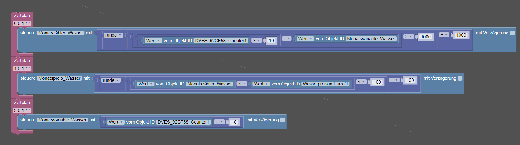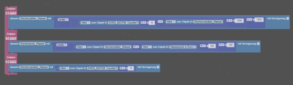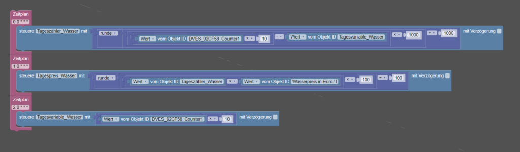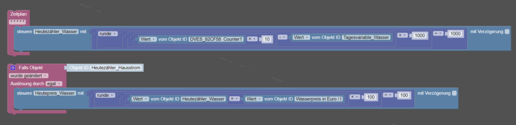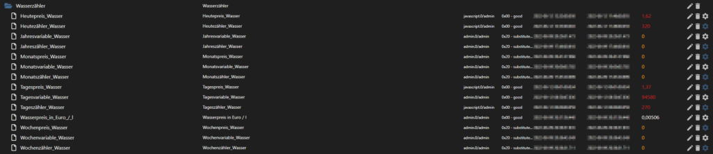 Jetzt muss im ioBroker noch ein bisschen gerechnet werden, um die interessanten Werte zu bekommen. Ich wollte den Wasserverbrauch pro Tag/Woche/Monat in l und den passenden Preis dafür, um es auf dem Hausautomations-UI auszugeben (analog dem Stromverbrauch).