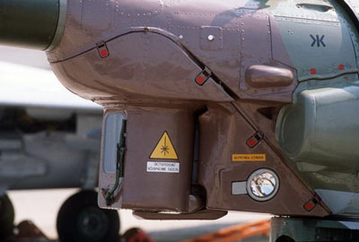 Der IR-Bugsensor bzw. Laserdesignator des Mi-28A aufgenommen auf der Le Bourget Luftfahrtmesse 1989. Erkennbar ist auch der eingeklappte Landescheinwerfer und eine RWR-Antenne (weißer Punkt oberhalb des Kinnturms) (Picture by US DoD).